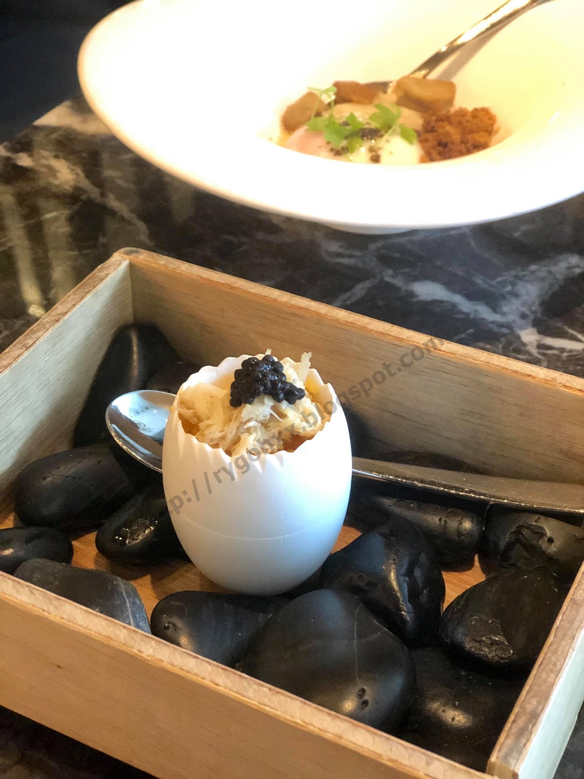 Before the high tea set , we got to choose between two different cooking methods of egg as shown above. The first photo with the plastic egg shell is the slow cooked eggs with crab meat, chives and caviar. The taste is great initially but as you eat to the bottom the egg is pretty salty. As for another appetizer,organic egg with truffle.